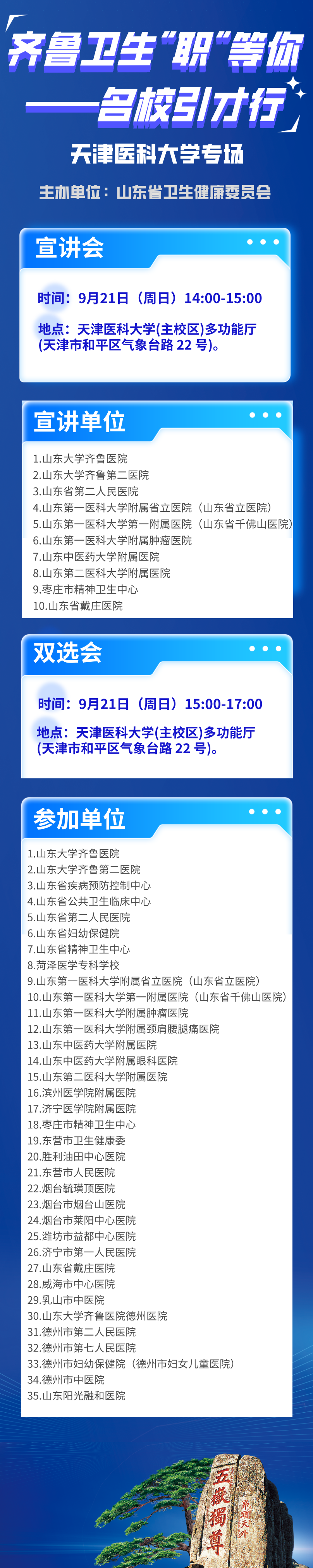 山东专场!9月21日14:00“齐鲁卫生‘职’等你—名校引才行”天津医科大学专场宣讲会、双选会敬请关注!