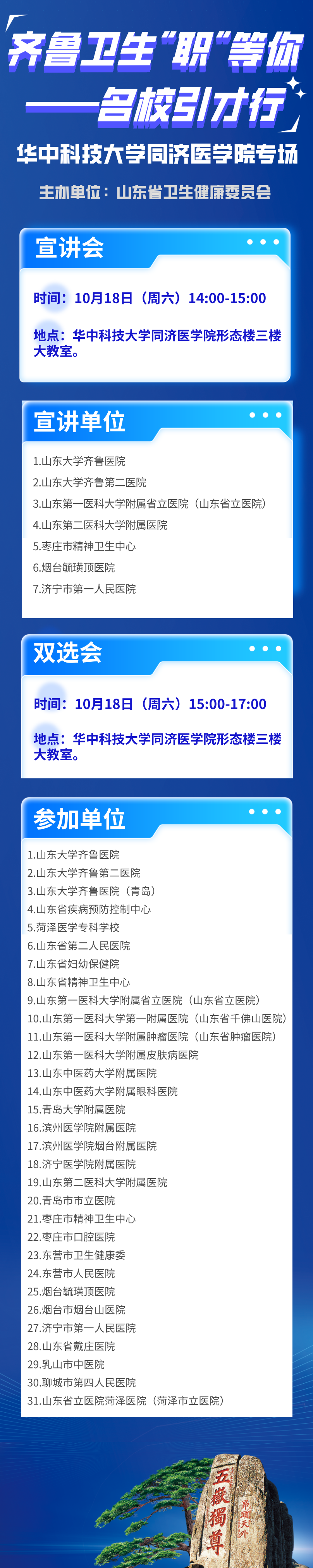 山东专场!10月18日14:00“齐鲁卫生‘职’等你—名校引才行”华中科技大学同济医学院专场宣讲会、双选会敬请关注!